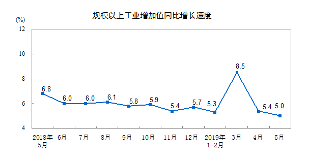根據(jù)數(shù)據(jù)報(bào)告統(tǒng)計(jì),2019年5月份規(guī)模以上工業(yè)增加值同比實(shí)際增長(zhǎng)5.0%(以下增加值增速均為扣除價(jià)格因素的實(shí)際增長(zhǎng)率),和上個(gè)月相比回落0.4個(gè)百分點(diǎn)。