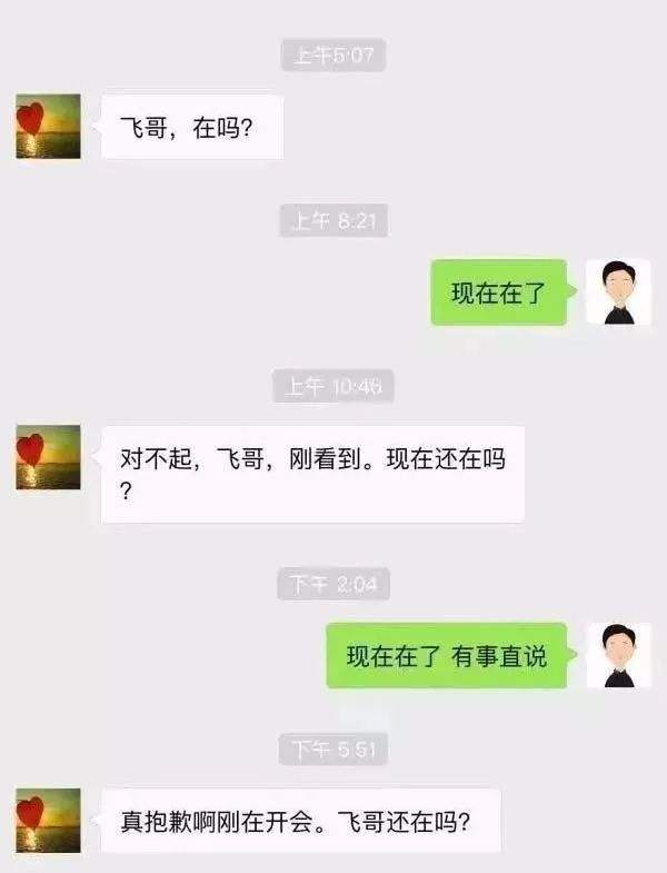 另一方面,當(dāng)你問(wèn)對(duì)方有什么事時(shí),如果對(duì)方暫時(shí)不在,隔了一會(huì)兒,又會(huì)回復(fù)你,這下在了,你還在嗎?這樣一來(lái)二去,還沒(méi)說(shuō)到正題時(shí),你已經(jīng)崩潰了。